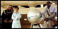 The romance between Arthur and Trillian, which reveals promise in their first scene together at the costume party, is quickly relegated to the back burner and then forgotten about until the woefully flat and anticlimactic finale. And, for what is clearly intended to be a jokey and dry British-style sci-fi comedy, there is a nagging dearth of charm. Sure, the viewer can tell when something is supposed to be humorous, but it by and large is not—even at a sold-out screening, the audience laugh-factor could be considered respectfully restrained, at best. Only the already-mentioned first couple of scenes and an interlude that depicts a just-existentialized whale falling to Earth and ruminating on life as he unknowingly is about to meet a nasty end could be considered successful. Likewise, there is fleeting hope that opinionated, depressed robot Marvin will come into his own and steal the film, but he never comes close to recognizing his capabilities.