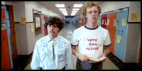 "Napoleon Dynamite" is light on a driving narrative, but hugely likable, nonetheless, as it follows its affectionate, offbeat characters through a few months in their shoes. Certain plot threads that threaten to come off as cliches, such as the budding relationship between Napoleon and Deb or the high school campaign for president, bypass where one would naturally expect them to lead and feel brand-new because of it. Most appreciably of all, director Jared Hess (a 24-year-old making his promising feature debut) refuses to talk down to his audience by spelling out every story development. He trusts that viewers are more quick-witted than most films treat them (he would be right), and so he spares us the more commonplace scenes that go along with comedies about teenagers. For example, when Napoleon and Deb end up dancing together at the school dance, their conversation is awkward, but warm, leading to a silent reciprocal respect for each other that transcends any dialogue Hess could have cooked up. And the scene, for once, doesn't end in a kiss. Later, when Deb gets mad at Napoleon over a misunderstanding, Hess drops the usual, tired apology and make-up sequence for something that is far more quiet and honest.